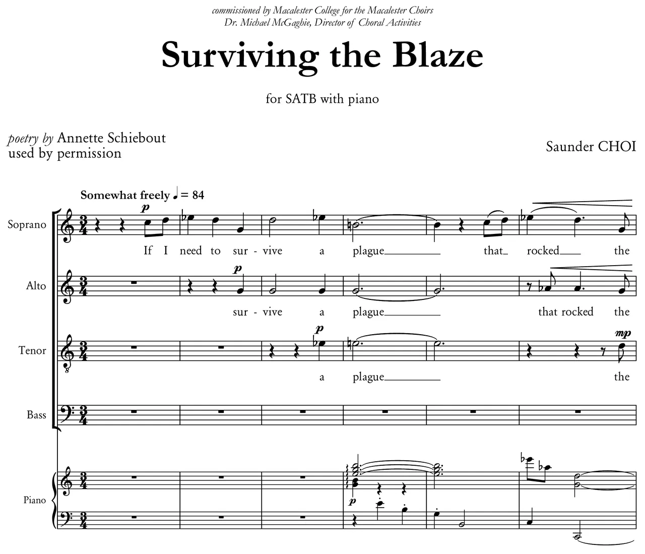 When Mike and I started talking about a new commission for Macalester, it was around the time that a piece I wrote for Vox Femina – Our Streets, A Symphony Again – was receiving its premiere. That piece was about the city of West Hollywood “reopening” after COVID isolation and quarantine. I thought it would be a great idea to look deeper into “reopening” stories from different cities. My friend Brian Sonia-Wallace (@rentpoet), who wrote the text for Our Streets then introduced me to Minneapolis based poet Annette Schiebout.