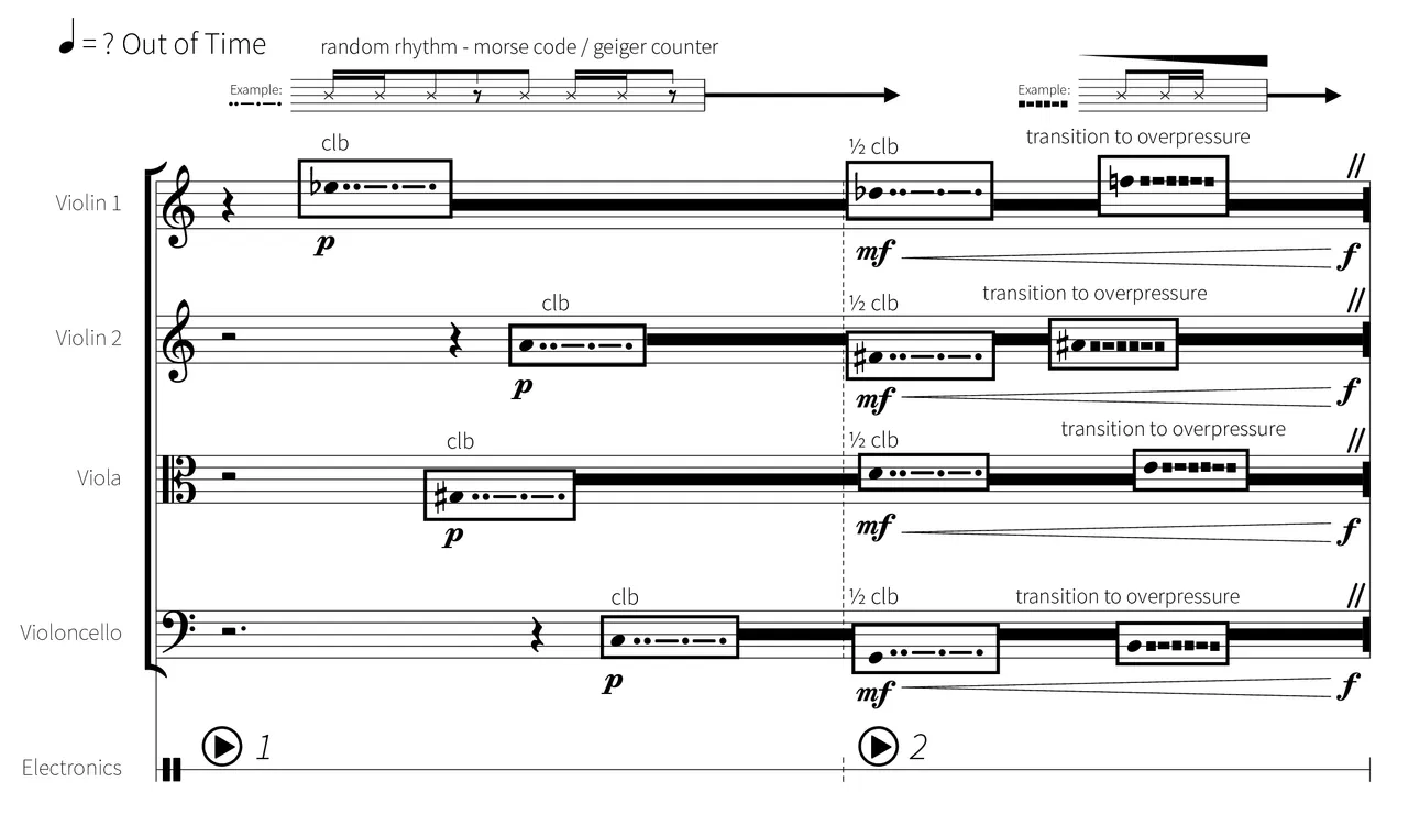 CHAIN4 OF DISASTEЯ is meant to capture a few feelings involving the Chernobyl disaster. The main feelings include anger, fear, and most of all uncertainty. There are several live electronic elements that enhance these emotions along with the string quartet. The main element is the use and live performance of a synthesizer Geiger counter instrument. At times, the string quartet joins this effect by mimicking the sounds of the Geiger counter. This is then matched with a cuing device that can trigger all 28 sound cues throughout the piece. Each cue is meticulously edited to either add a glitch, pitch shift, distortion, or combination of effects to a line of spoken text. Most of the cues have been edited to the point where the original spoken text is almost unrecognizable. This was done intentionally to mimic the use of voice changers to mask the identity of the speaker and old warped tapes that have degraded sonically over time.
