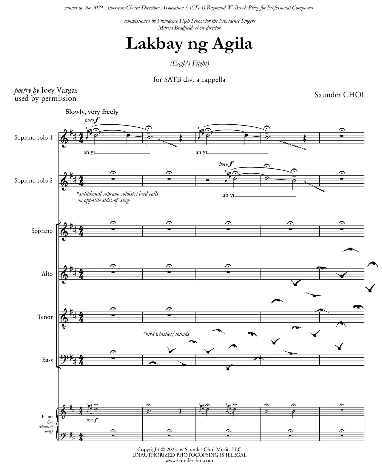 Lakbayng Agila (Eagle's Flight) was commissioned by Providence High School for the Providence Singers, under the direction of Marisa Bradfield. Providence High School is a learning community where compassion, service, dignity, and justice are at the heart of their mission. Like the eagle's journey, their young people prepare for the majestic flight out into the world, always leading with empathy, strength, and love.