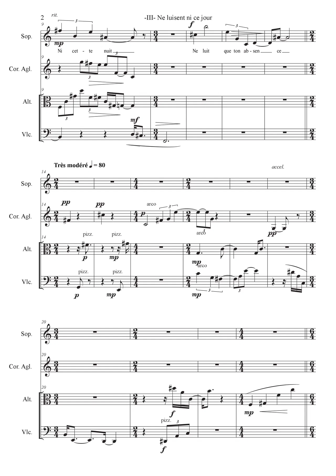 Part of a cycle of twelve pieces for soprano and three instruments (English horn, viola and cello): "Psaumes de l'absence" (Psalms of absence).