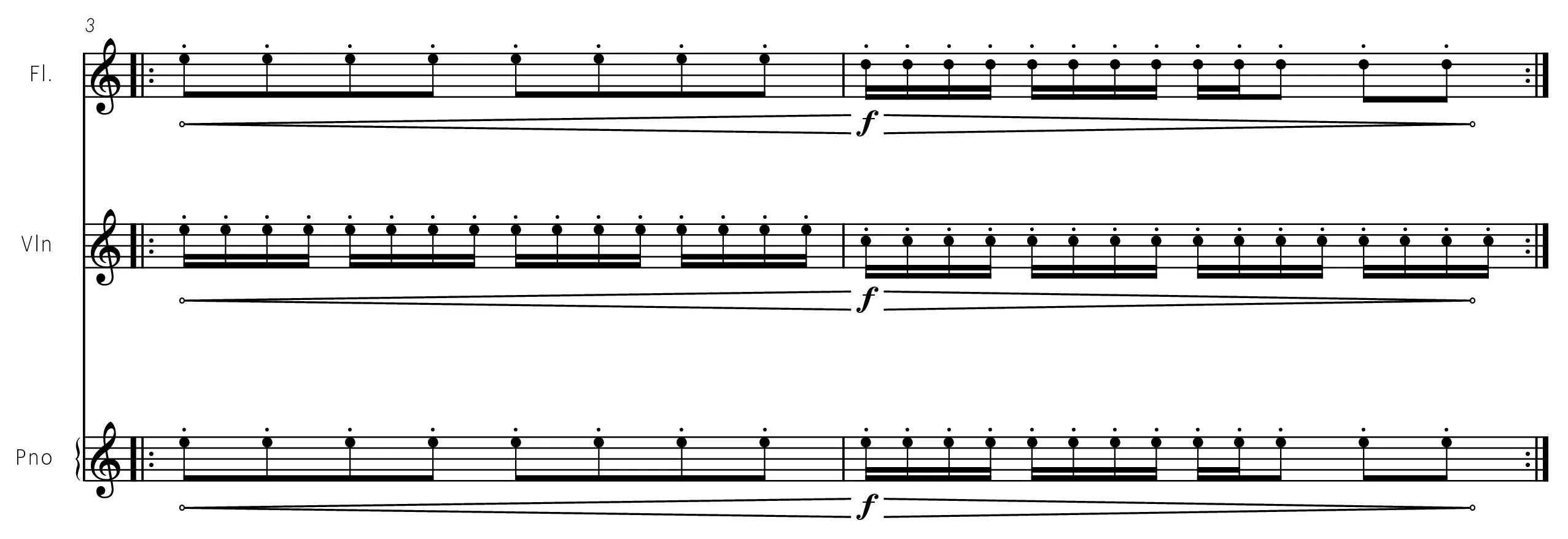 All performing members of Telos have their own unique metronome, each with a different tempo (e.g. 60 bpm, 61 bpm, 62 bpm etc.), repeating ad libitum cyclical chunks of music in an organizational style called Polytempo. What I hide from you is the beauty found in differing configurations of the metronomes, tighter or wider divisions, reserved only to myself and future performers of the work.