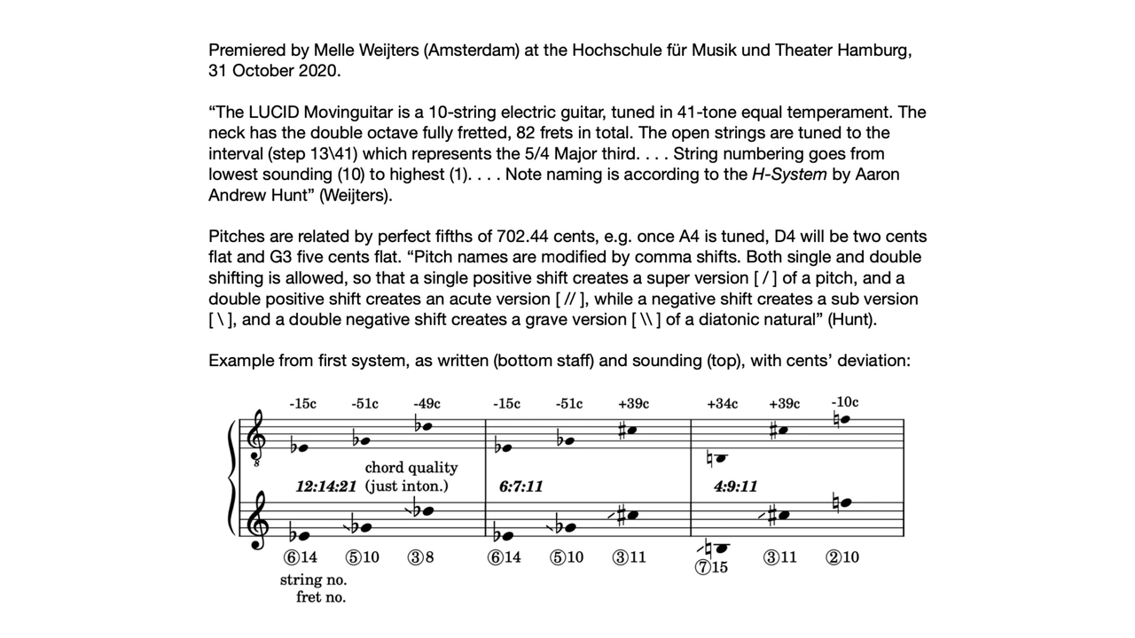 Sunshine and Shade (2020), for solo electric guitar, was written in Gary Morrison’s 88-cent scale on a 41-tone instrument, viz. every third fret of the 10-string, 82-fret Lucid Movinguitar. Since the scale neatly divides the perfect fifth into eight equal steps my next incentive came from Iacobus de Ispania (d. after 1330), who is reported to have classified the 9/4 major ninth as a concord, and I composed as if using a scale of 16 chromatic steps per doubly-augmented octave. In each of the two movements only nine pitch classes are used, such that key transpositions at the perfect fifth would be most harmonically distant and transpositions at the diminished fifth would be least distant, in contrast to our conventional diatonic scale system. Dedicated to my mother, Victoria Harrop.