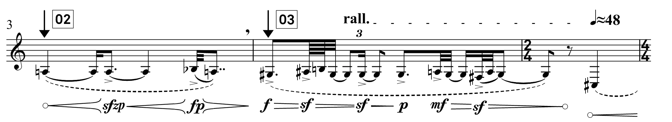The final section is written in a semi-aleatory style and can be performed extemporaneously through improvisation. The aim of this improvisation is to allow the performer to reach, using the sonic materials of the piece, the saturation of their technical abilities and physical limits. This boundary, to be understood in a purely musical sense and not as a conceptual or theatrical element, is the sound achieved through the maximum effort to fuse the instrument's body with the performer's physiology. This sound, being unique to each performer, cannot be fixed or standardized.
