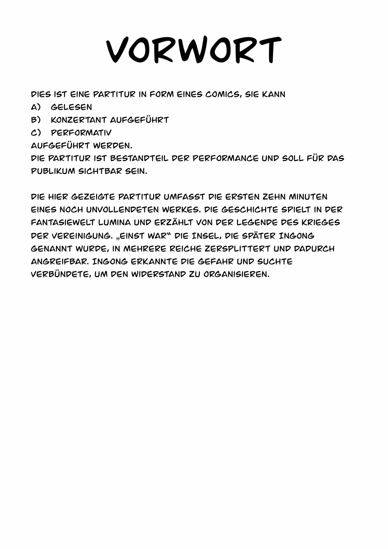 THE SCORE SHOWN HERE COVERS THE FIRST TEN MINUTES OF A WORK THAT IS STILL UNFINISHED. THE STORY TAKES PLACE IN THE FANTASY WORLD LUMINA AND TELLS THE LEGEND OF THE WAR OF UNION. “ONCE, THE ISLAND THAT WOULD LATER BE CALLED INGONG WAS FRACTURED INTO SEVERAL REALMS AND THEREFORE VULNERABLE. INGONG RECOGNIZED THE DANGER AND SOUGHT ALLIES TO ORGANIZE THE RESISTANCE.”