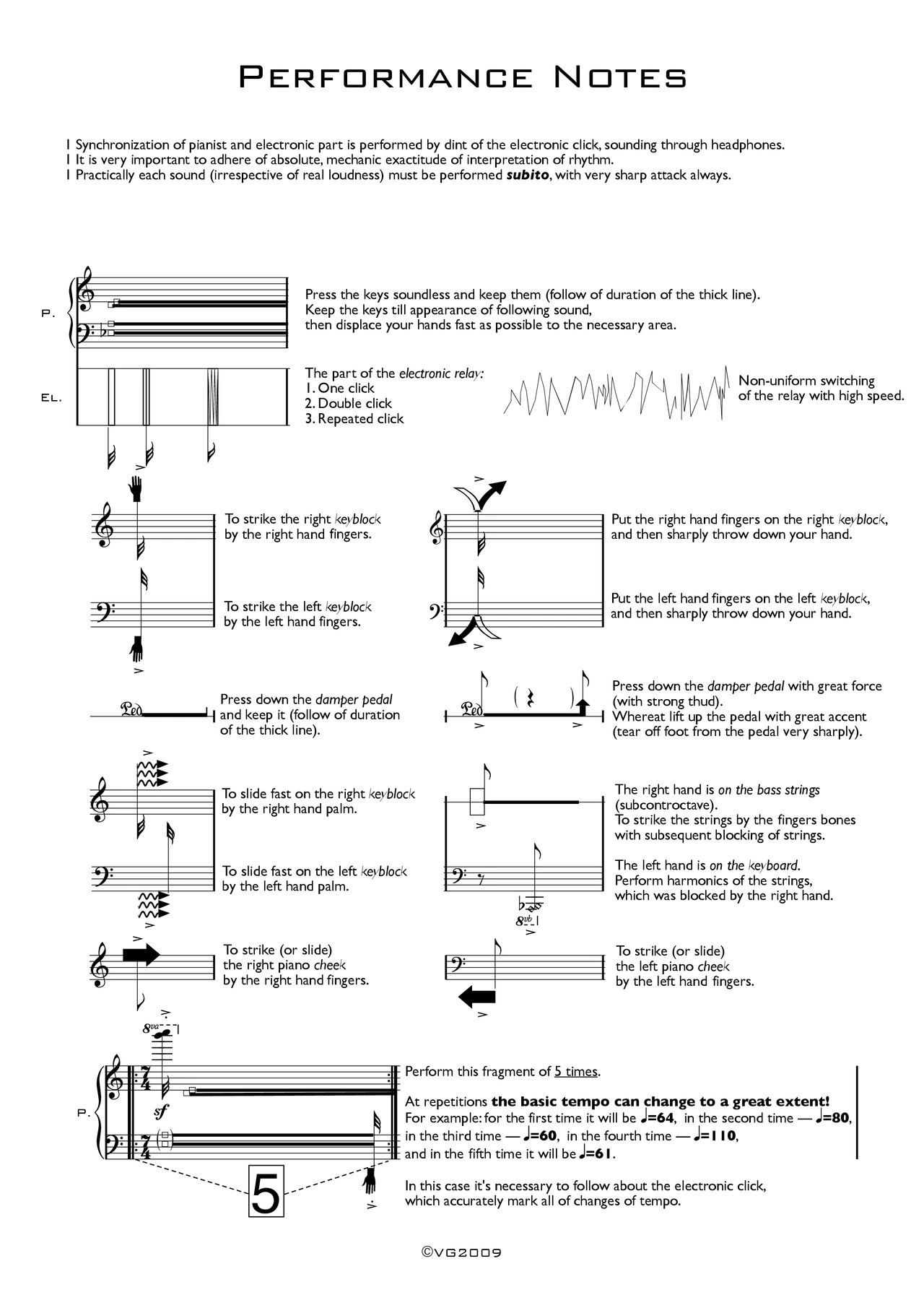 The composition Accent Sequence explores the idea of a biomechanism. The performer (pianist) and the apparatus (an electric relay placed on the piano strings) form a single integrated system. The score contains two parallel sequences: highly accentuated, percussive actions for the pianist, and opening/closing actions for the relay. The piece is structured so that the pianist’s gestures align rhythmically with the relay’s activity, creating a unified mechanism of interaction based on a predetermined sequence.