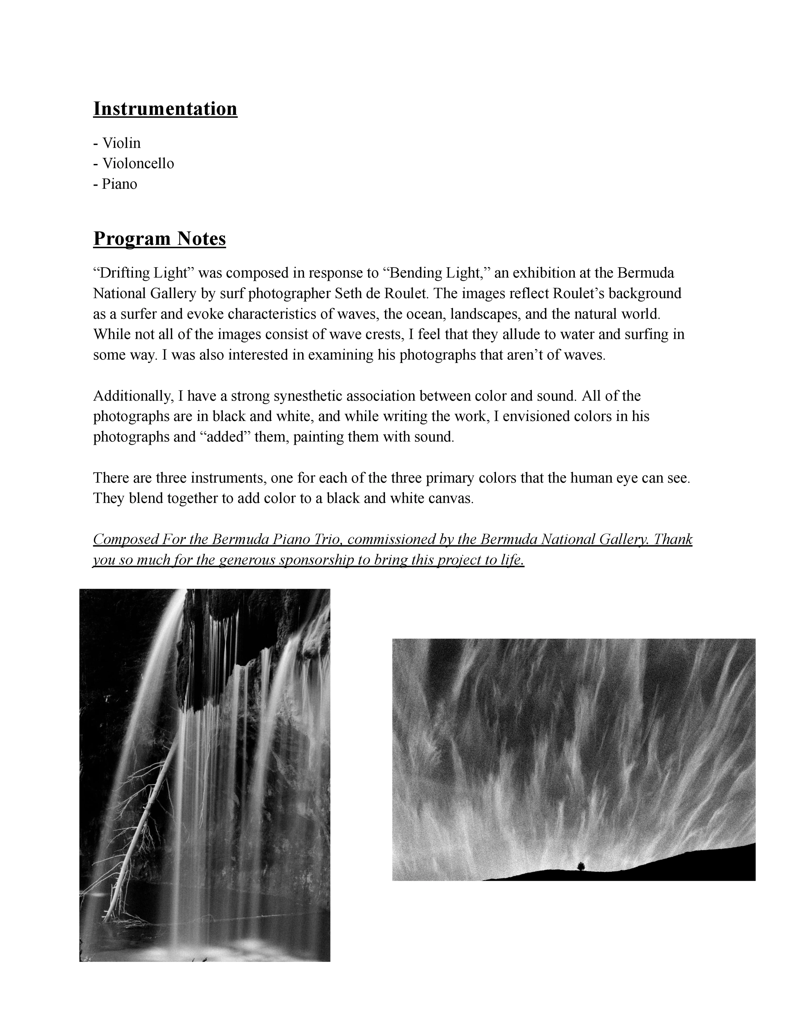 “Drifting Light” was composed in response to “Bending Light,” an exhibition at the Bermuda National Gallery by surf photographer Seth de Roulet. The images reflect Roulet’s background as a surfer and evoke characteristics of waves, the ocean, landscapes, and the natural world. While not all of the images consist of wave crests, I feel that they allude to water and surfing in some way. I was also interested in examining his photographs that aren’t of waves.