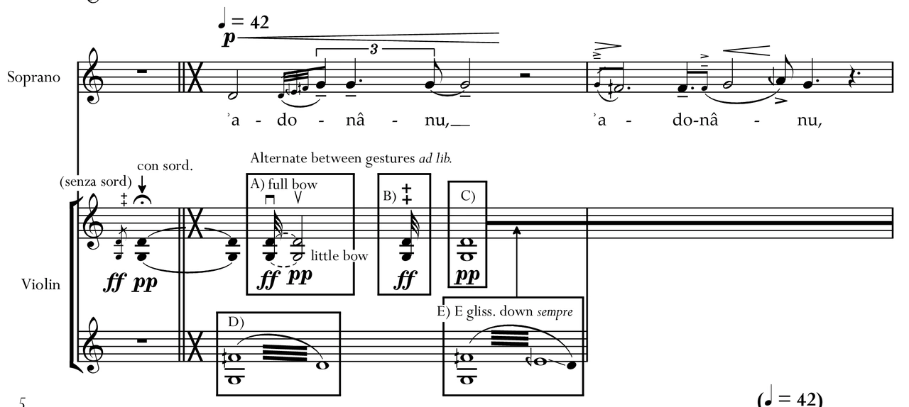 In performance, the violin and soprano engage in an intricate interplay of texture and expression, mirroring the shifting tones of grief, remembrance, and transcendence. The violin part includes subtle inflections reminiscent of Arabic maqam, microtonal shading, and extended techniques that create an evocative sound world—at times raw, at times ethereal. The soprano navigates between speech-like intonations and soaring lines, embodying both the spoken word and the spiritual lament.