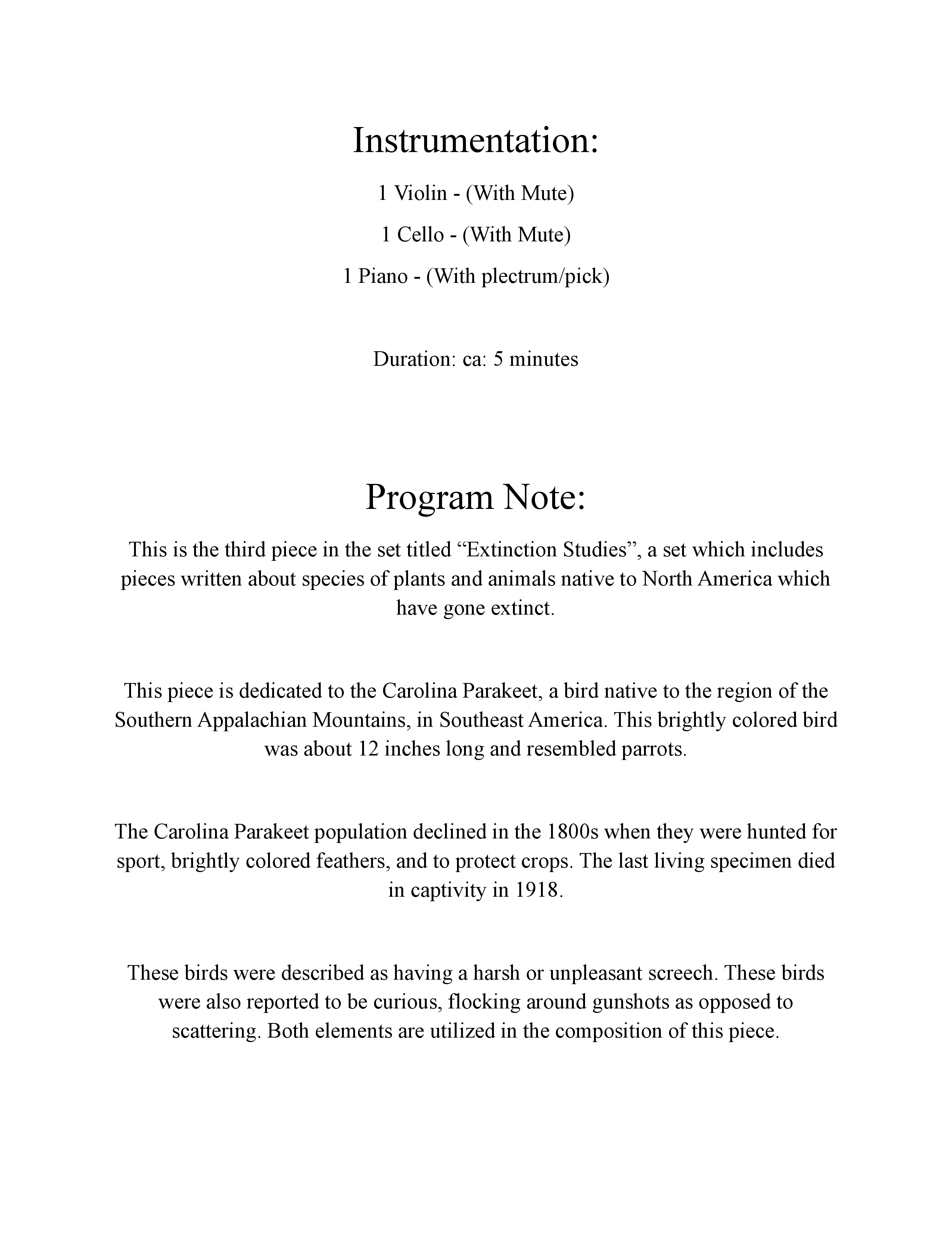 These birds were described as having a harsh or unpleasant screech. These birds were also reported to be curious, flocking around gunshots as opposed to scattering. Both elements are utilized in the composition of this piece.