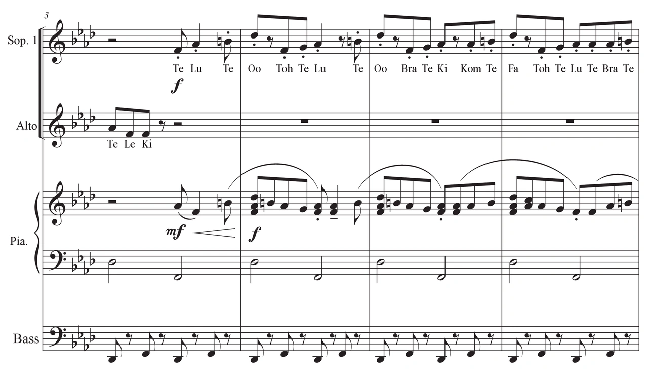 For Soprano 1, Soprano 2, Alto, piano or keyboard, trombone, 5-string electric bass, violins and cellos. Sopranos 1 and 2 are operatic singers. The alto is a soul-pop type singer.