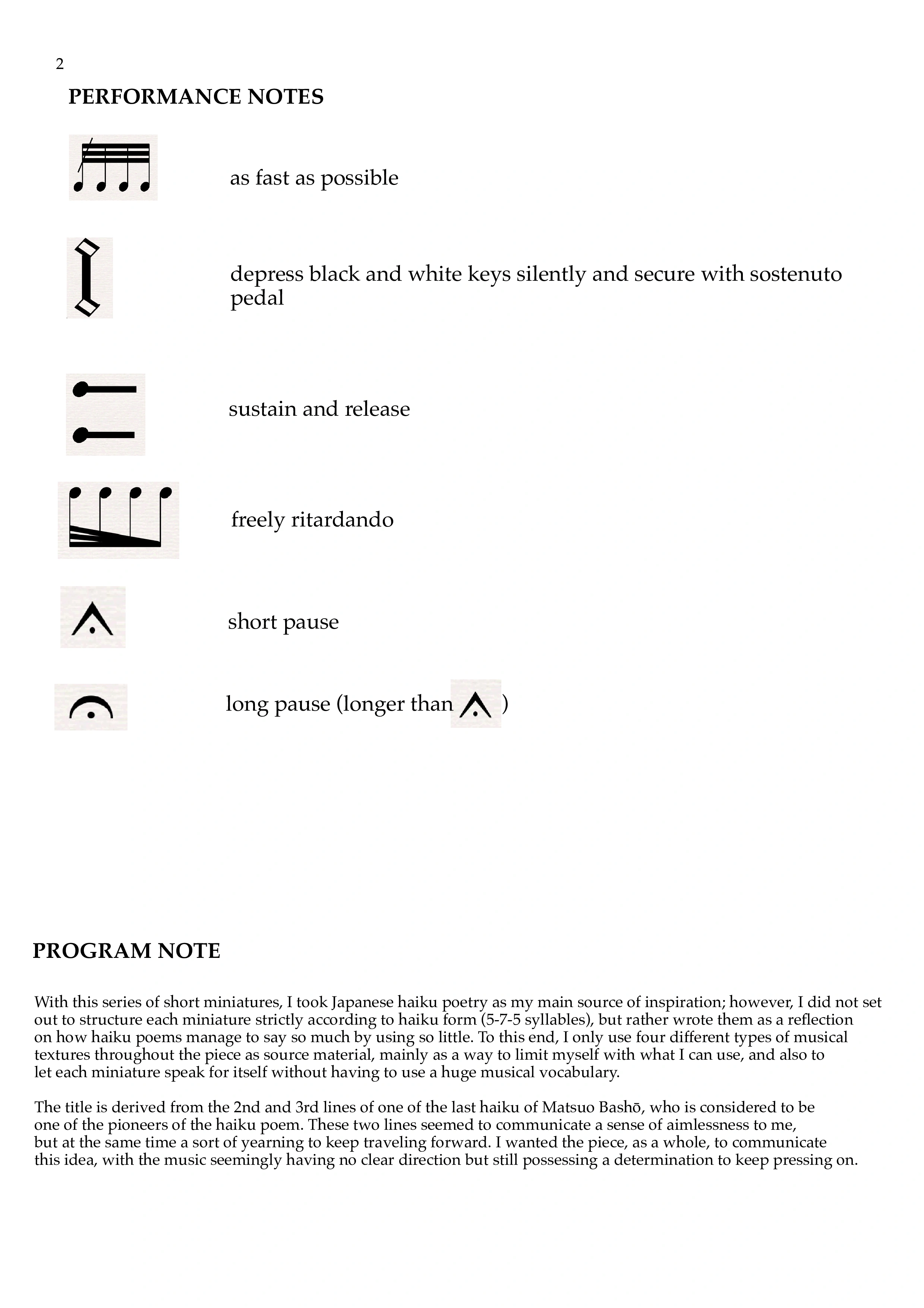 With this series of short miniatures, I took Japanese haiku poetry as my main source of inspiration; however, I did not set out to structure each miniature strictly according to haiku form (5-7-5 syllables), but rather wrote them as a reflection on how haiku poems manage to say so much by using so little. To this end, I only use four different types of musical textures throughout the piece as source material, mainly as a way to limit myself with what I can use, and also to let each miniature speak for itself without having to use a huge musical vocabulary.