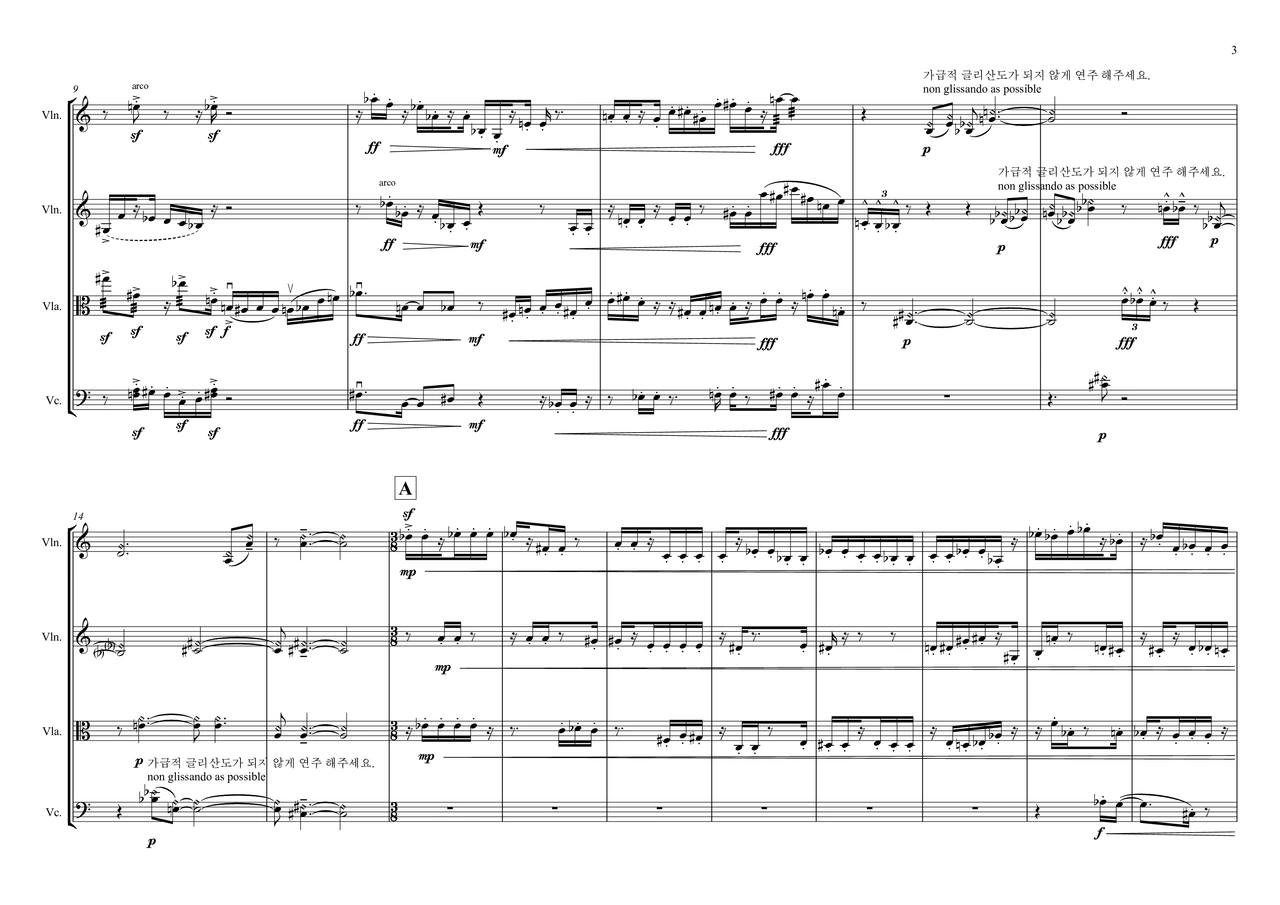 Apparently, this piece required two breakthroughs: first, I chose a narratively structured form, in which—similar to a serialized novel—one block follows another, and I aligned my working rhythm consistently with this “novelistic” method. Second, I radically reduced the material: a homogeneous sound body (string quartet), almost no extended techniques, and a rhythmic language largely based on sixteenth notes.