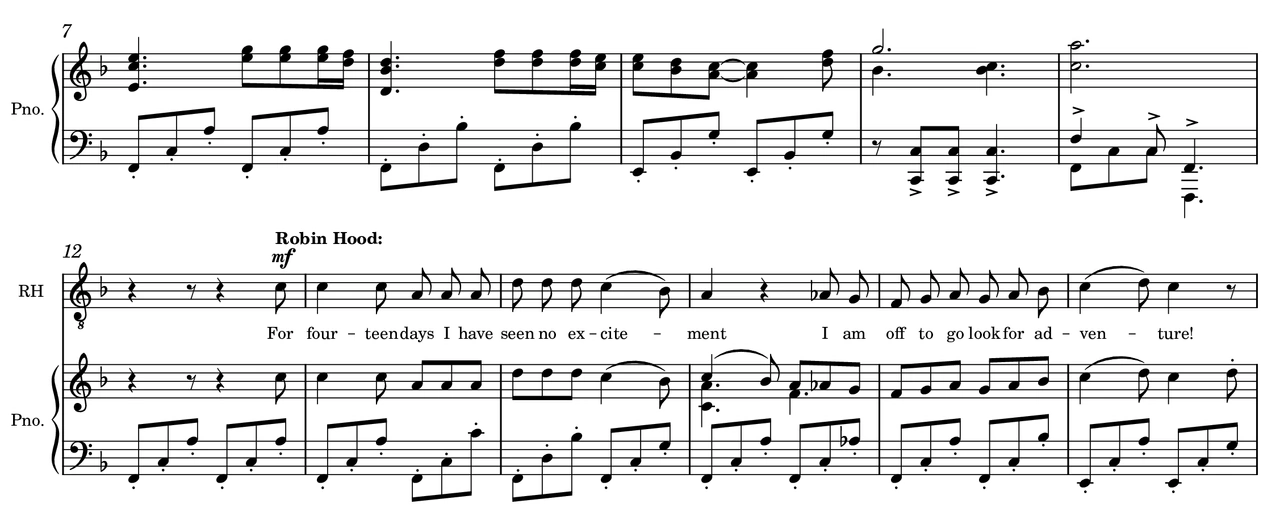 The Merry Adventures of Robin Hood of Great Renown in Nottinghamshire is an 1883 adaptation and compilation of medieval ballads related to the legendary character of Robin Hood. It was written by Howard Pyle as a collection of these ballads told in chronological order, from the origins of Robin Hood, to his death. Many of these ballads are unused in most media that represent Robin Hood, and are unknown even to avid readers. This first vignette includes the ballads of Robin Hood’s origin as an outlaw and his recruitment of Little John. This vignette will be part of a larger operatic work that allows it to either be performed by itself as a self-contained story (like a ballad) or in combination with subsequent vignettes (like Pyle’s adaptation). This opera is composed with the goal of accessibility to amateur and young/emerging professional singers. The target audience is primarily first time opera-goers, although I hope it can be entertaining to even opera fanatics.)