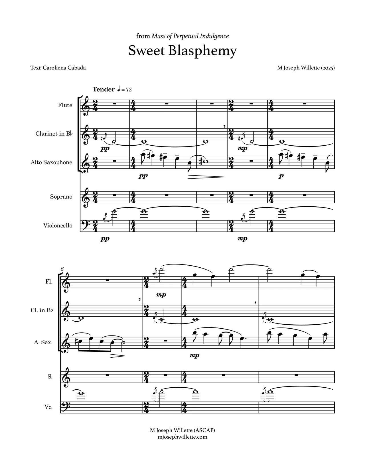 "Mass of Perpetual Indulgence" for chamber orchestra, electronics, soprano solo, and