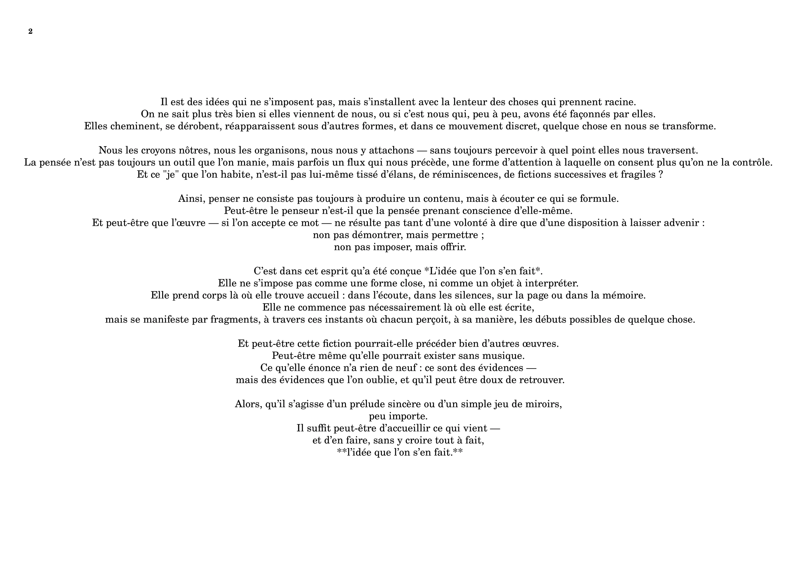The piece explores the different modes of existence of a musical work in general. Its realization in the physical world is only one stage. In reality, the piece truly begins the moment it is conceived, and it never really ends: it becomes memory, for each listener who was present on the day of the concert. Each person, then, will form their own idea of it, shaped by the distortions inherent in thought and in the words we use to tell it to ourselves.