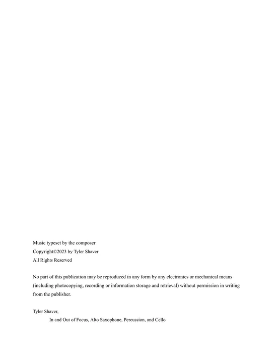 In and Out of Focus poses philosophical questions about the relationships between individual instruments and the ensemble. Instruments shift between working with each other in a particular sonic world and working against each other, layering contrasting sonic worlds. Attention shifts between sonic worlds as instruments get louder and softer.