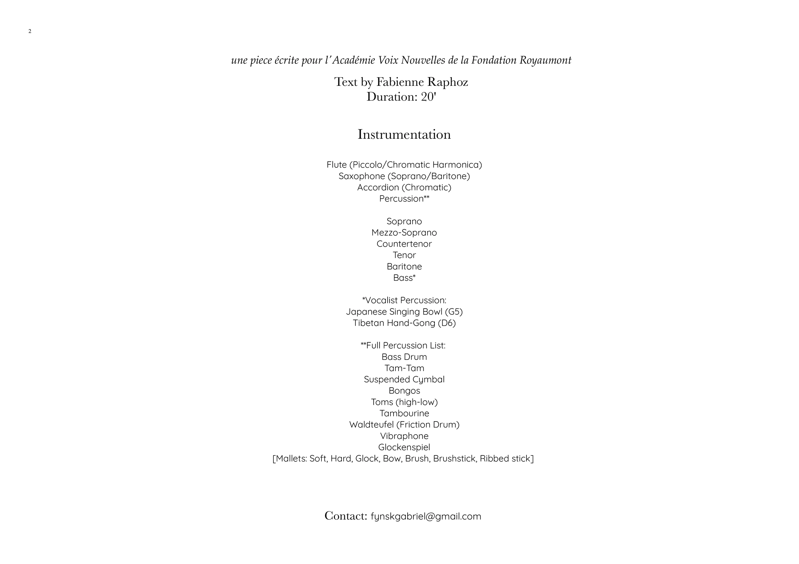 Diaphonie is a musical explication of Listening as mishearing. Its title refers to the ironic multiplicity of the wordâs etymology: as overhearing, as polyphony, as dissonance, and as phonemic correspondence. Through seven characterized âmisreadingsâ, each attracted to a certain potentiality or phonemic pattern of Fabienne Raphozâs poem, 'Conus arenatus', Diaphonie traces the resonances of the re-embodied word in music and strains towards the possibility of meaning in its absence; âechoes of the first waveâ âthe silent origin and end become reverberating.