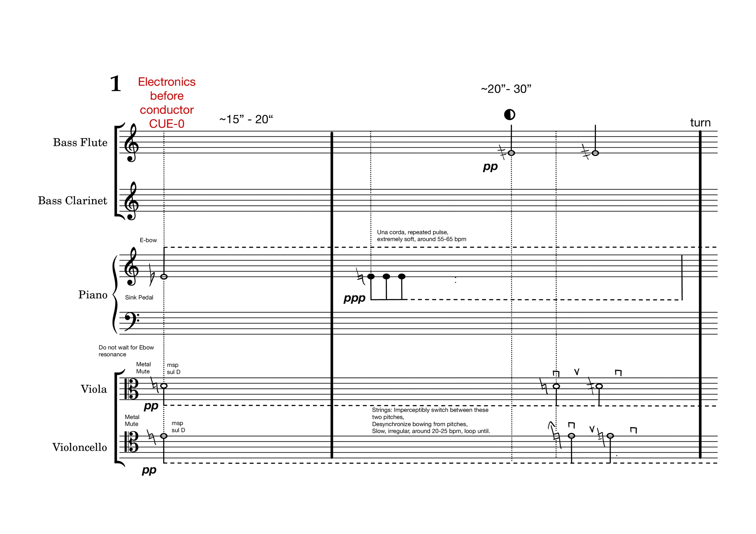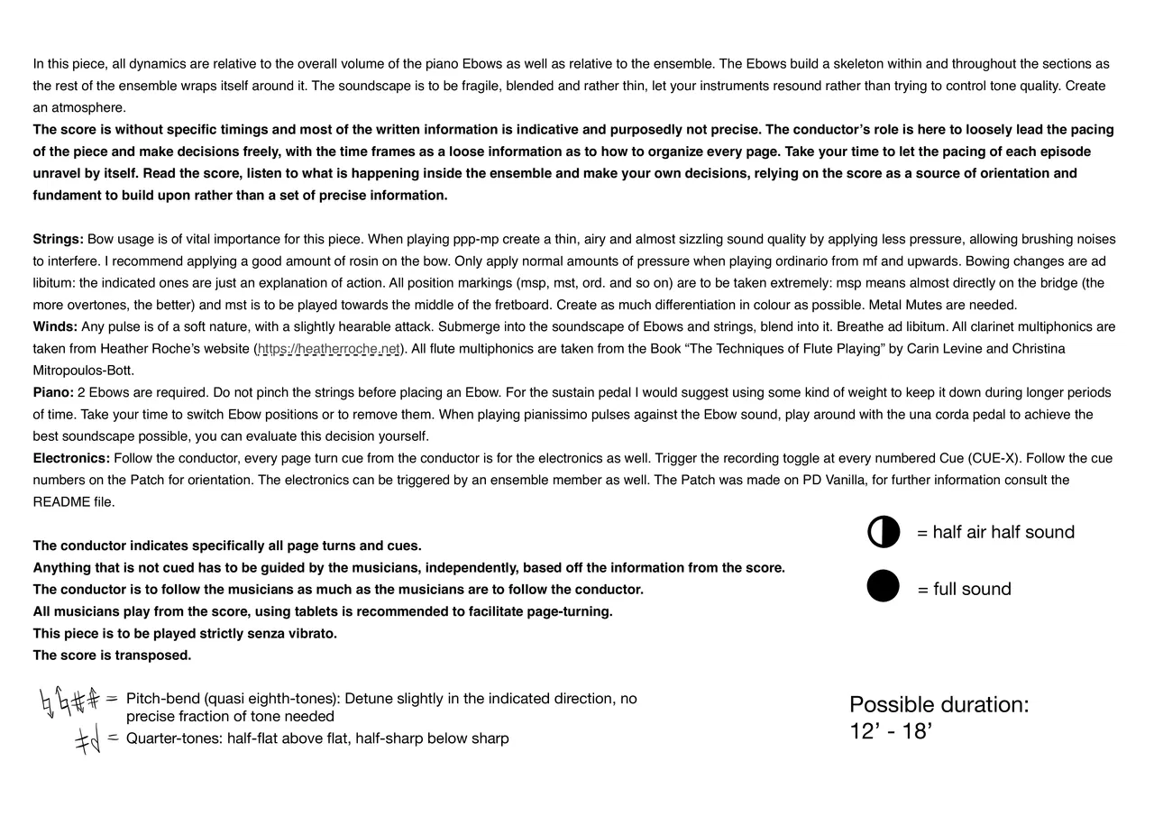 The agency of the conductor in this ensemble is critical: the conductor determines timings and durations of single instances, with the displayed durations in the score being only a mere suggestion. The conductor depends on the ensemble members’ decisions and can only act and make shape the piece according to them.