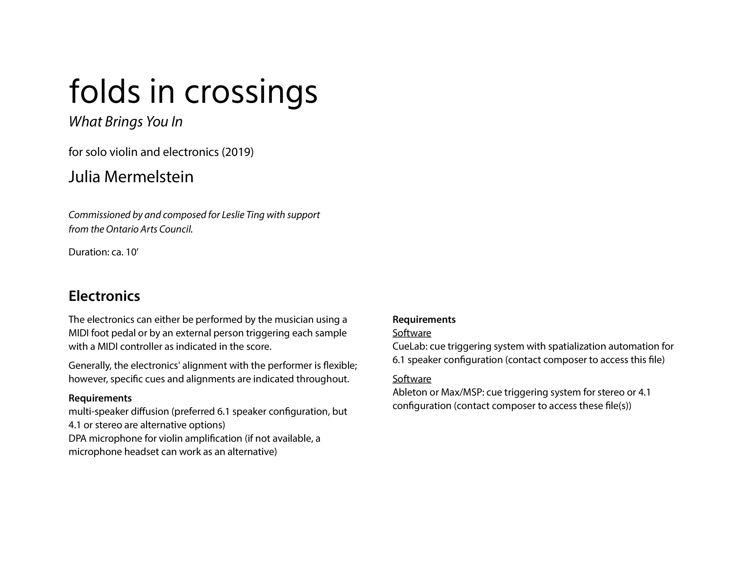 "folds in crossings" is one of five pieces of a larger interdisciplinary work, "What Brings You In," created by Leslie Ting. A violinist confronts the noise of her psyche in an electroacoustic soundscape. A percussionist sifts through her subconscious with a sandbox as an instrument. Based on interview research, and personal experiences with talk therapy, hypnotherapy, dreamwork, sandplay, somatics, and reiki, this experimental, music-driven work is an exploration of where and when our truest selves emerge through a series of sound pieces.