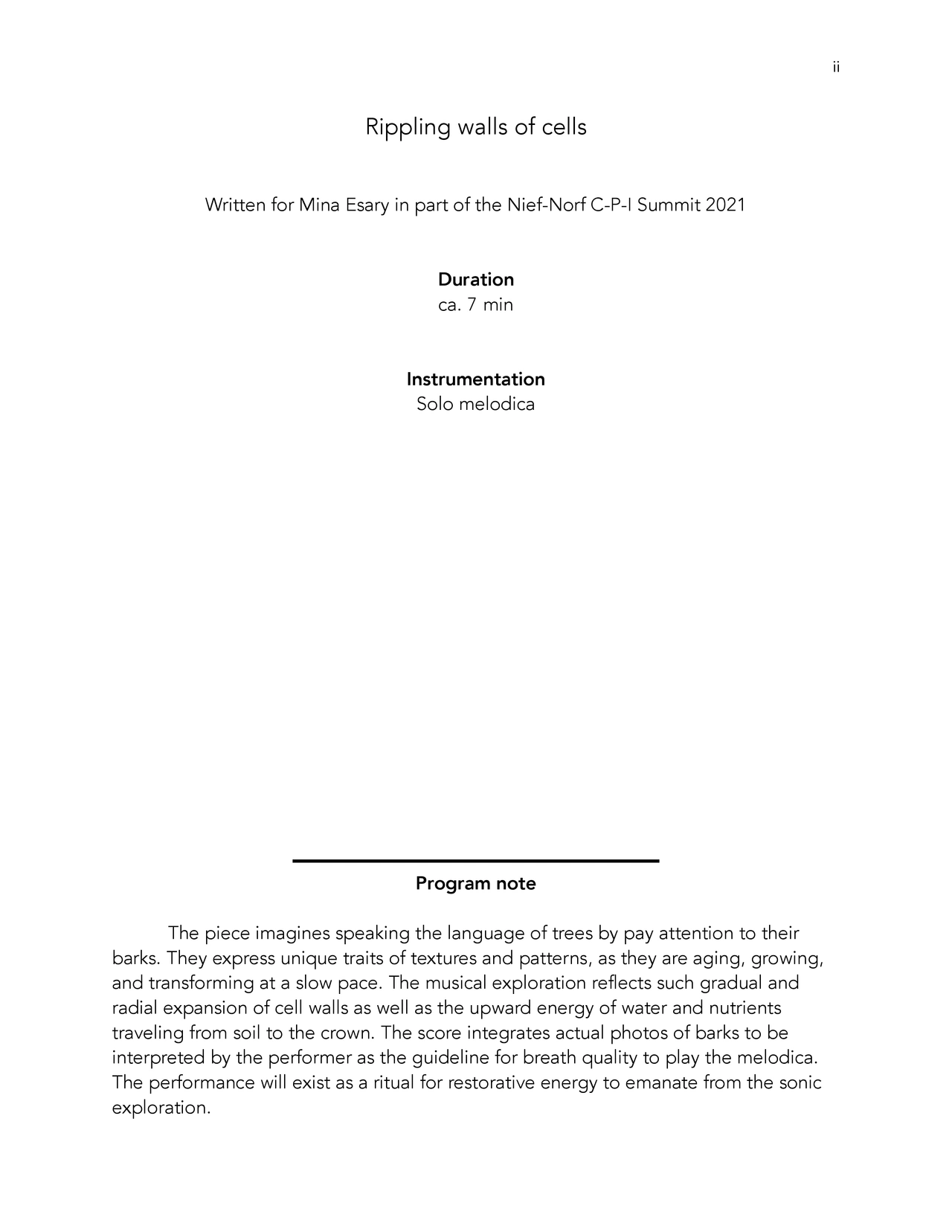The piece imagines speaking the language of trees by paying attention to their barks. They express unique traits of textures and patterns, as they are aging, growing, and transforming at a slow pace. The musical exploration reflects such gradual and radial expansion of cell walls as well as the upward energy of water and nutrients traveling from soil to the crown. The score integrates actual photos of barks to be interpreted by the performer as the guideline for breath quality to play the melodica. The performance will exist as a ritual for trees and their flourishing life.