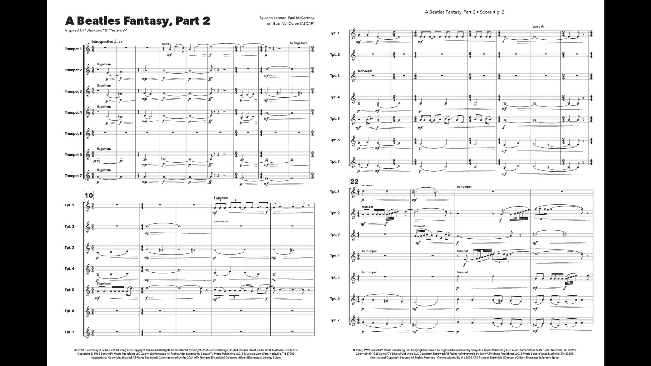 "A Beatles Fantasy" for Trumpet Septet includes themes from several classic Beatles selections, including "Because," "Eleanor Rigby," "Blackbird," "Yesterday," "Hey Jude," and "Come Together." The ATX Trumpet Ensemble, directed by Gilbert Elorreaga and Jeremy Spicer, commissioned the work for their participation in the 2024 National Trumpet Competition.