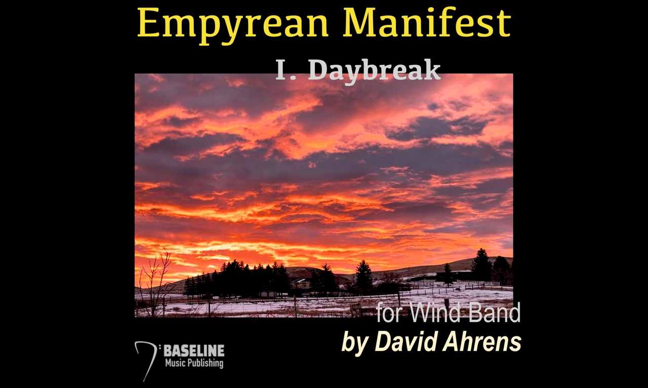 "Empyrean Manifest" for Wind Band, by David Ahrens. An ever-changing canvas of dazzling beauty, power, and wonder - the sky tells a story that connects us to every other person on earth and to every generation of mankind. I. "Daybreak" is the opening scene, the lifting of the curtain on what will be: The sunrise. II. "Battle Cry" shares the power, excitement, and - at times - chaos of a mighty thunderstorm. III. "Glory" is the culmination of the day and the closing of the sunlight's interaction with our view of the sky. It's often the most beautiful time of the day and - at least in Wyoming - is different and humbling with each iteration. Thank you for listening - I hope that you enjoy Empyrean Manifest! - David.