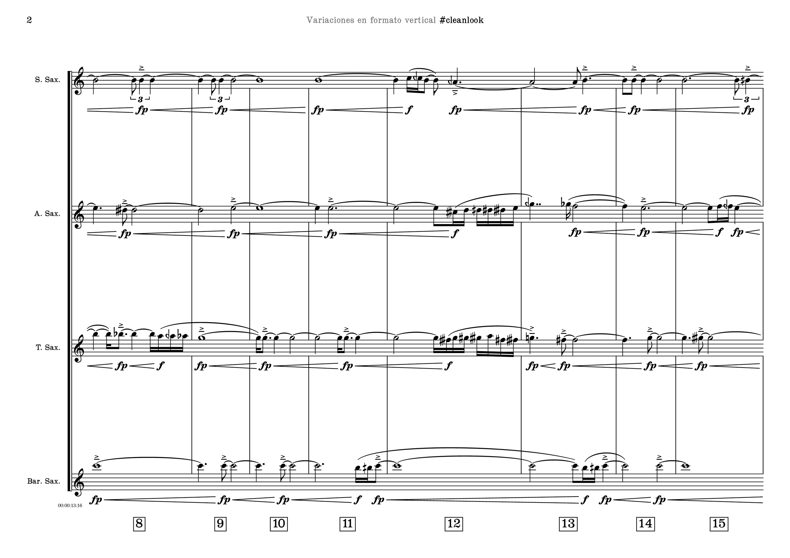 "Variciones en formato vertical" is a piece composed of 8 short movements. Each explores a simple musical idea and develops it. The movements are: "I. #cleanlook", "II. #mindfulnessroutine", "III. #unboxing", "IV. #ad", "V. #healthyfood", "VI. #minimalism", "VII. #genderreveal", and "VIII. #housetour". Each of these movements is inspired by a typical social media action, translated into a musical language that reflects the speed and immediacy of these platforms.