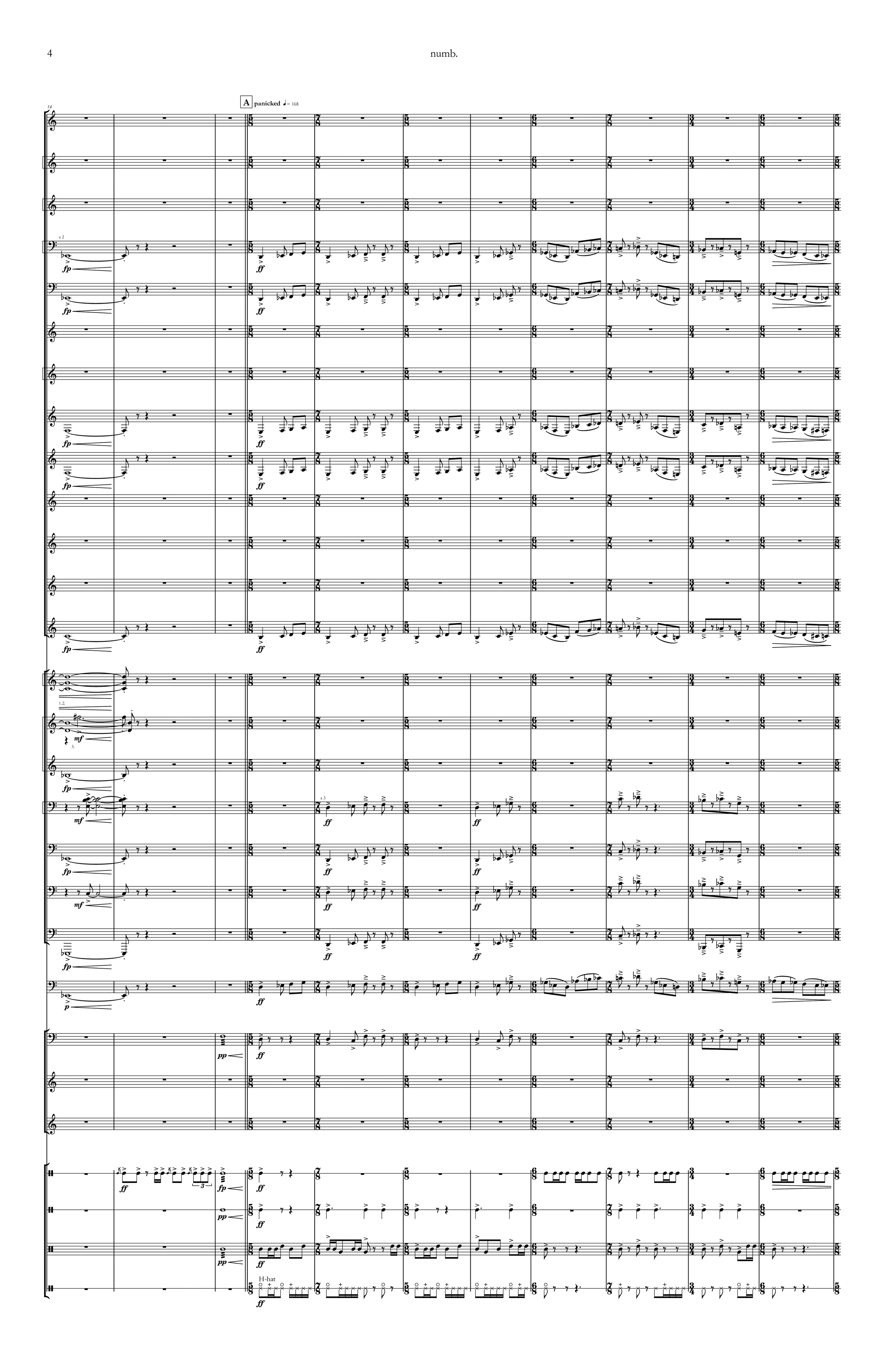 This thought brought about "numb." - a large work for wind ensemble in three sections. Each section opens with a melodic theme, whose notes are taken from the first letter of several news outlets (Fox News, CNN, BBC, etc.), each theme previewing the general style of the section it is introducing. The first section represents the rage-baiting and fear-mongering stories from journalists just trying to get clicks and engagement, featuring aggressive and angular low brass ostinati and dissonant harmonies in the upper winds and brass. The second section represents the traumatic and depressing stories, featuring a chorale-like passage typical of a band work on a similar theme, transitioning into a passage featuring biting low brass harmonies and the same melody repeated in a more disjunct setting in the upper winds. The third section represents the outrageous and absurd stories (think your typical "Florida Man" story), featuring syncopated motives and a driving rhythm section led by the hi-hat, bongos, and double bass.