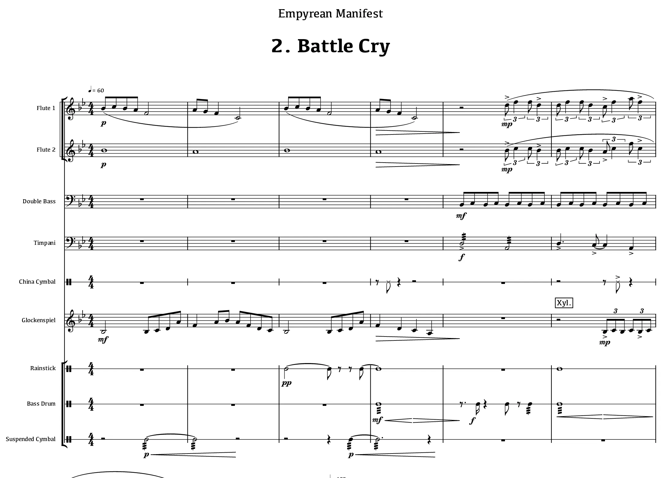 "Empyrean Manifest" for Wind Band, by David Ahrens. II. Battle Cry. An ever-changing canvas of dazzling beauty, power, and wonder - the sky tells a story that connects us to every other person on earth and to every generation of mankind. Battle Cry shares the power, excitement, and - at times - chaos of a mighty thunderstorm. At the time that I write this, two movements of Empyrean Manifest are complete: I. Daybreak and II. Battle Cry. Coming soon will be the conclusion, III. Glory. I hope you enjoy Battle Cry! - David