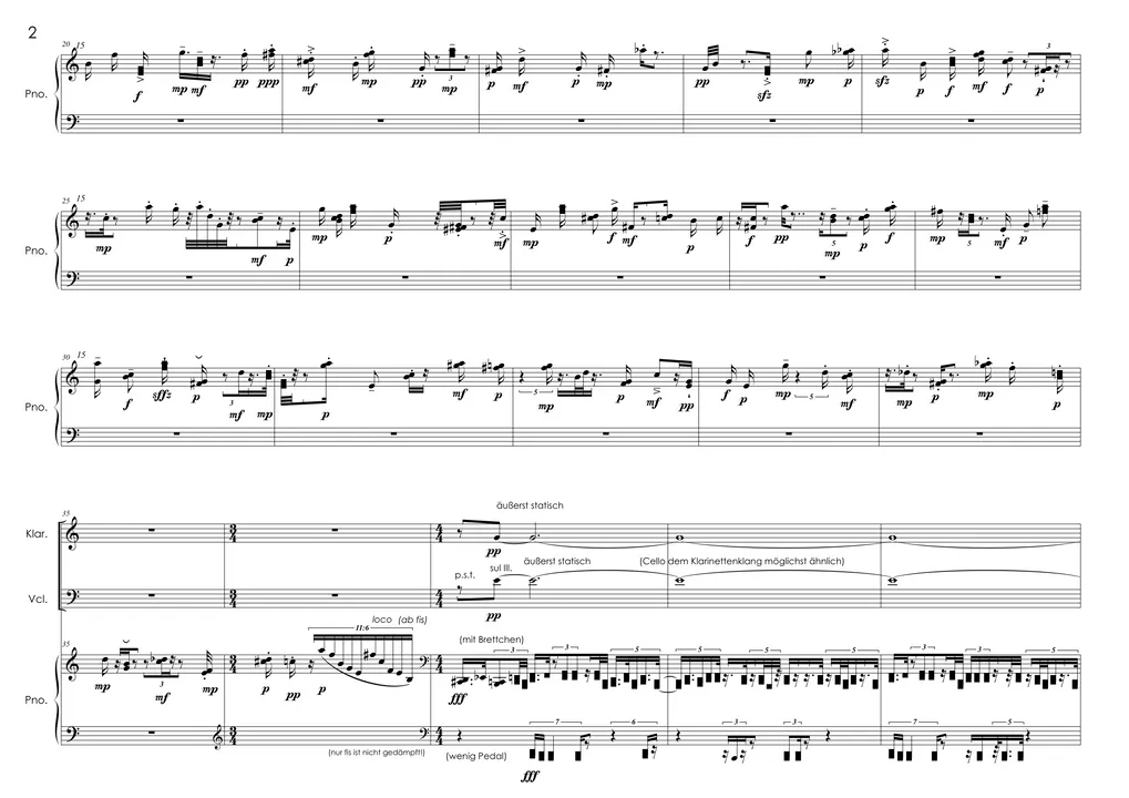 “Composition means: building an instrument.” "Unter Verschluss" for clarinet, cello and piano follows this maxim of Helmut Lachenmann by reimagining the typical sonic idiom of this instrumentation and transforming it into an individual sonic structure. The tradition of a predominantly full, dark sound world in the famous Clarinet Trios by Johannes Brahms and Alexander Zemlinsky is simultaneously continued and heavily defamiliarised through emphatic intensification. This is achieved by applying various preparations to the cello and piano for much of the piece that greatly mute their sounds. Only the clarinet retains its usual, naturally pale basic sonority. "Unter Verschluss" eschews anything that is obvious, middling or open. A cloaked, muffled and dim sound predominates,