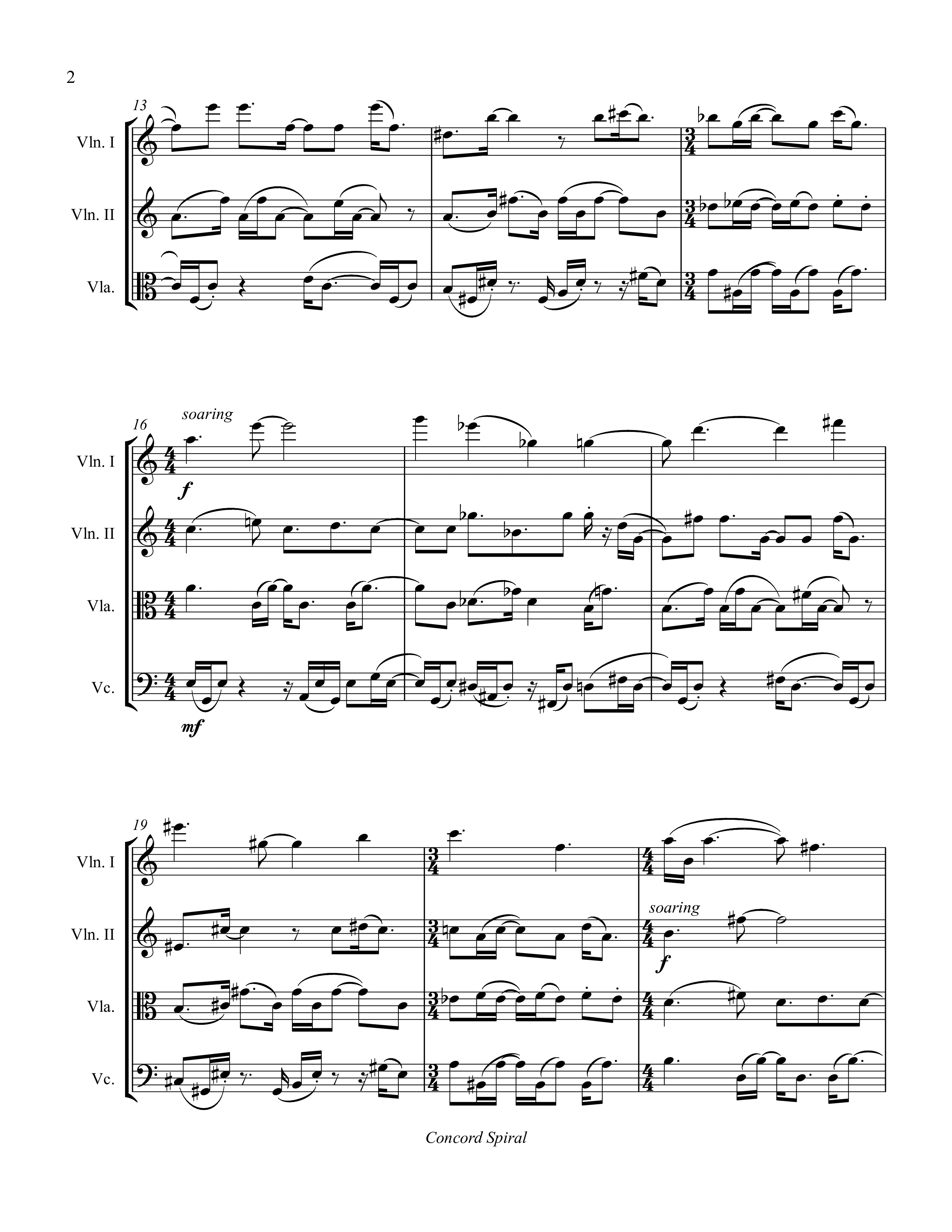 Concord Spiral is the fifth in a series of what I call spiral canons, canons that proceed through a continuously modulating harmonic progression. The original inspiration came many years ago from a book on canonic technique by Bernhard Ziehn (1845-1912), a German music theorist and composer teaching in Chicago. I had written such canons at rhythmic intervals of 5 and 7 beats (Cyclic Aphorism 3 and Chicago Spiral, respectively), and also at 83 beats (Hudson Spiral), and I wanted to try one with something in the middle. This canon for string quartet is at a 19-beat rhythmic imitation and at the descending minor seventh. I began it in Concord, Mass.