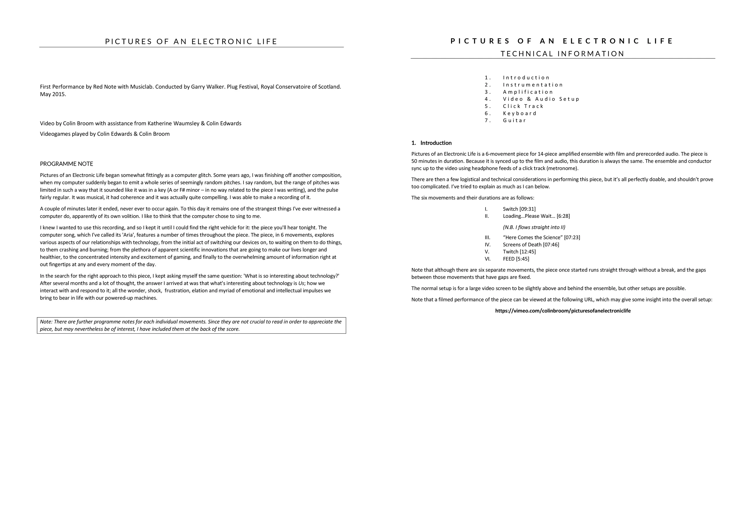 Pictures of an Electronic Life began somewhat fittingly as a computer glitch. Some years ago, I was finishing off another composition, when my computer suddenly began to emit a whole series of seemingly random pitches. I say random, but the range of pitches was limited in such a way that it sounded like it was in a key (A or F# minor – in no way related to the piece I was writing), and the pulse fairly regular. It was musical, it had coherence and it was actually quite compelling. I was able to make a recording of it.