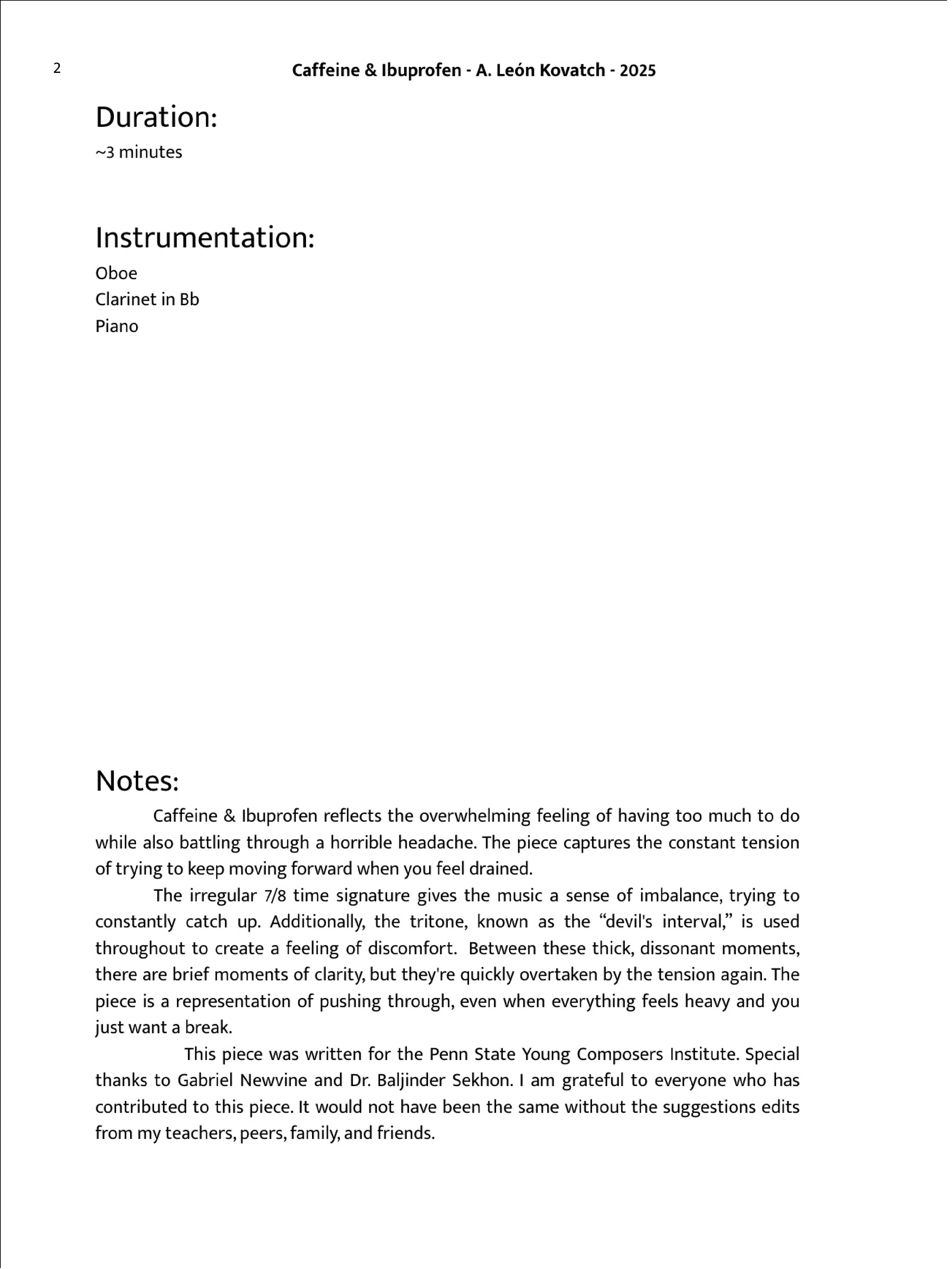 This piece was written for the Penn State Young Composers Institute. Special thanks to Gabriel Newvine and Dr. Baljinder Sekhon. I am grateful to everyone who has contributed to this piece. It would not have been the same without the suggestions edits from my teachers, peers, family, and friends.