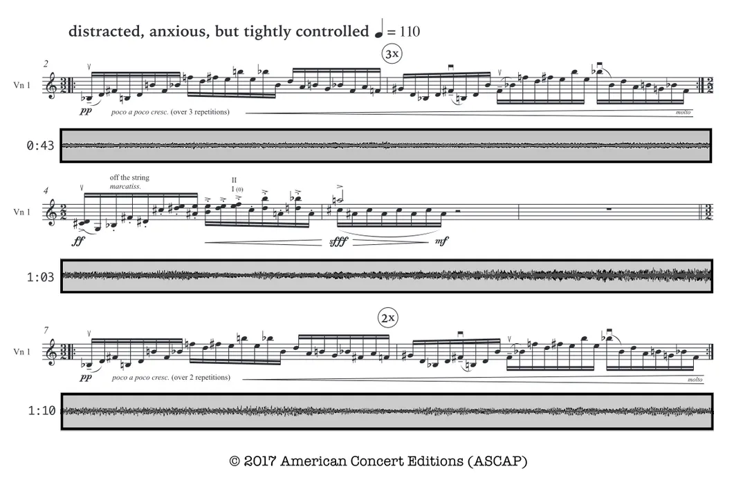 When the electronics reach their loudest, most explosive point, the quartet reenters, struggling against the overwhelming electronics, continuing to push back, in fits and starts, as the electronics subside. Their jagged, erratic polyrhythms slowly become more regular, and they eventually achieve a much more peaceful space. But in this final passage, there’s a slightly brightened consonance that bolsters the quartet’s role as a relieving counterweight to the harrowing electronics, one that may even provide an affirmative message in the end. Special thanks to New Music USA and the University of Chicago for their support of this project.