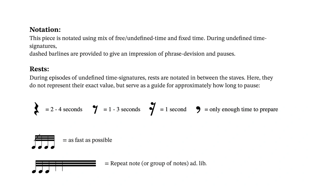 This piece is notated using mix of free/undefined-time and fixed time. During undefined time-signatures, dashed barlines are provided to give an impression of phrase-devision and pauses. This piece makes use of a Palm mute Pedal, developed by Otto Sammy. The pedal enables the player to freely mute and unmute sections of the piano to create a dry percussive attack.