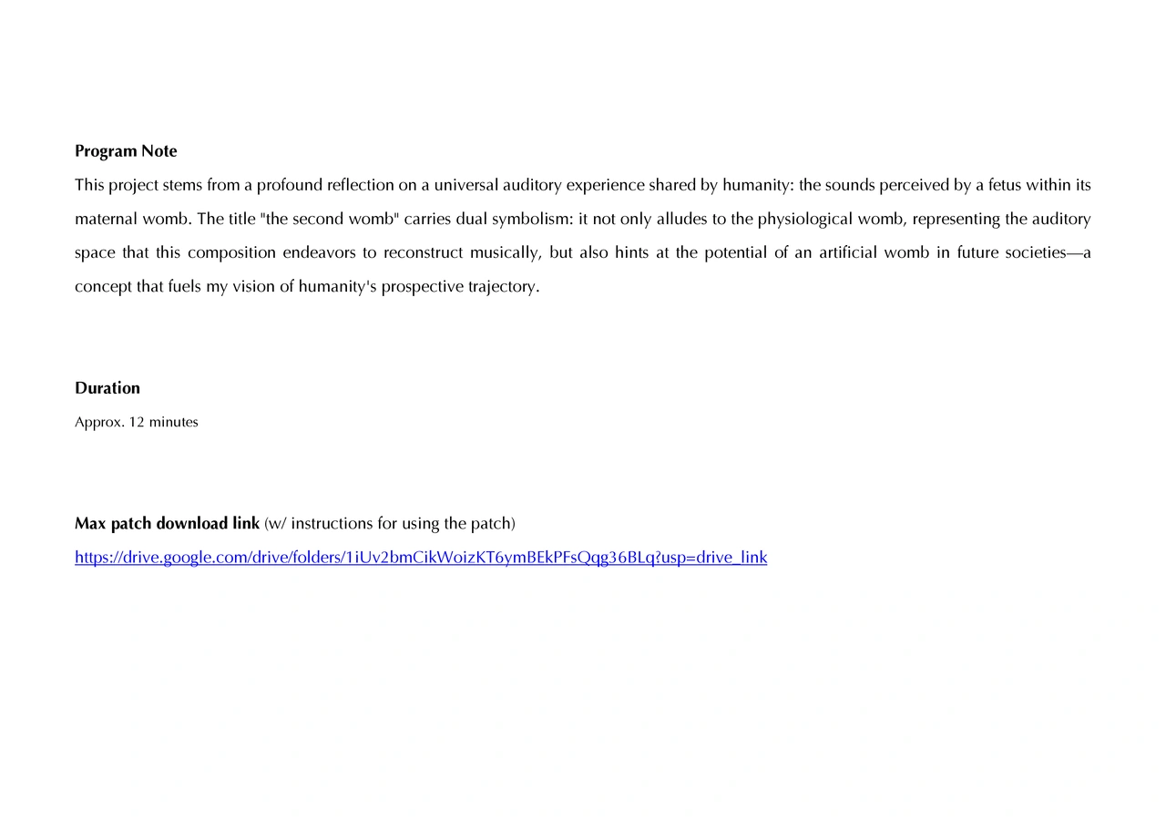 This project stems from a profound reflection on a universal auditory experience shared by humanity: the sounds perceived by a fetus within its maternal womb. The title "the second womb" refers both to that original listening space and to a future, imagined artificial womb—a concept that fuels my vision of humanity's prospective trajectory.