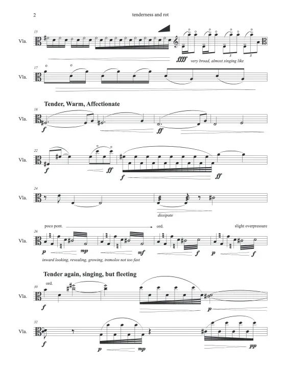 The work is scored for solo viola and a pre-recorded track. The track consists mostly of viola samples and some electronic sounds. Both elements continue to find juxtapositions. The live viola alternates between rapid notes in an unstable and erratic manner while playing natural harmonics that are filled with resonance and outlining a consonant major chord. The track plays harmonies that sound very consonant, but it explores both coldness and warmth in the tone simultaneously. You will also hear quarter tones lingering that oppose the overall consonant feel of the work. It is my hope that a listener will find beauty in this piece with all the opposing elements that somehow work together.