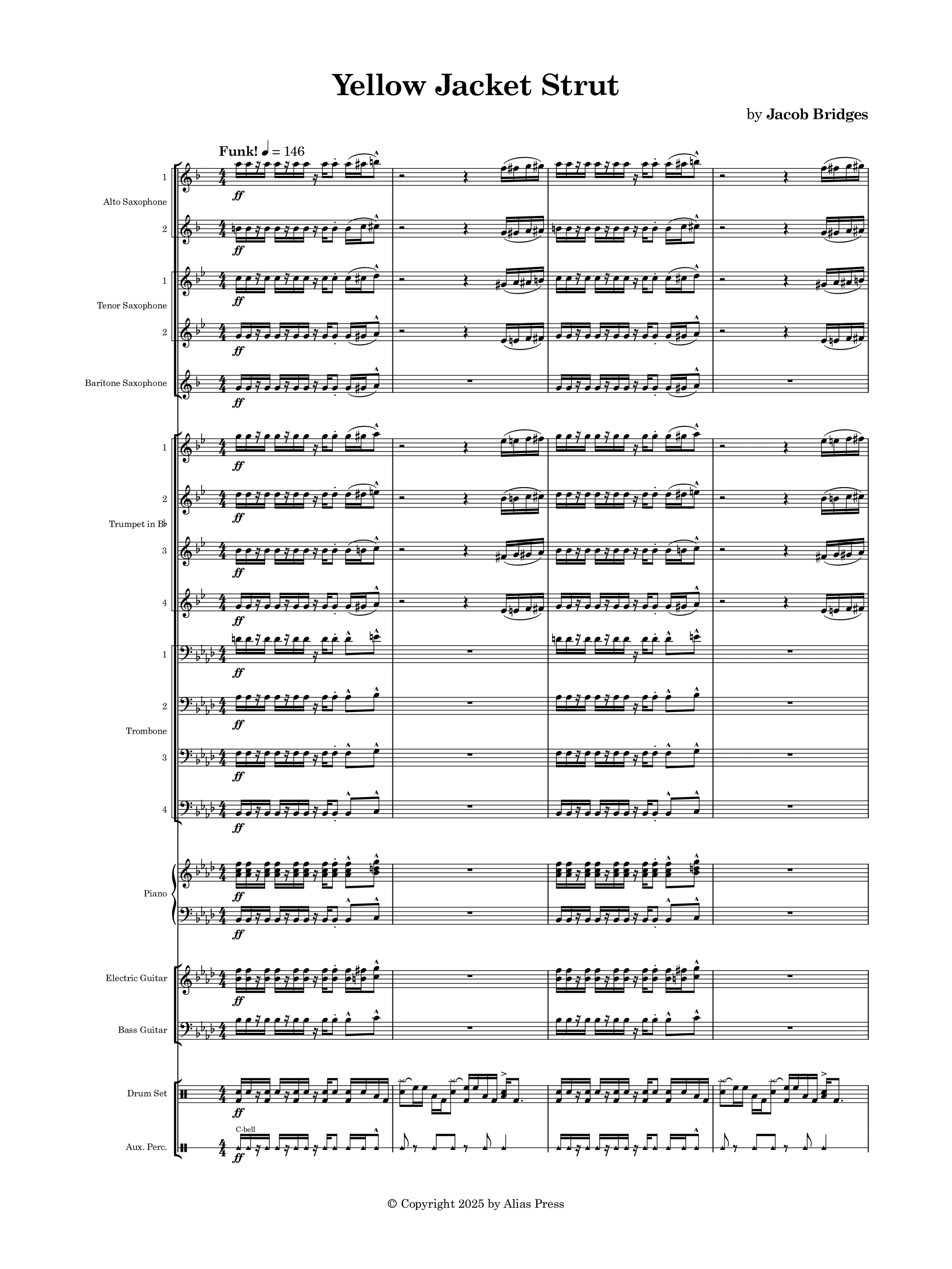 "Yellow Jacket Strut" was commissioned by the Iowa High School Jazz Band from Iowa, Louisiana (William Ishee Jr., Director) in the spring of 2022. The title is derived from the school’s mascot, the Yellow Jackets, and there are a few sections of the music that match the “stinging” nature of a yellow jacket. This is a standard funk chart that is perfectly suited for high school jazz bands, with plenty of opportunities to feature soloists and stretch the technical capabilities of young musicians.
