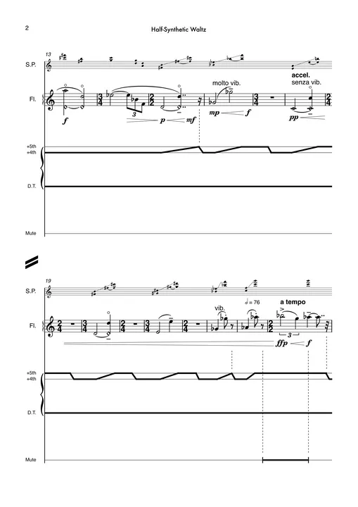 'Half-Synthetic Waltz' was conceived as a dance between two characters, with one half of this strange pair a natural figure, represented by the acoustic flute, the other a synthetic construction, realised by the pitch shifting electronics that respond to the flute’s melody. The descriptor of ‘waltz’ is used, not to indicate the piece’s metre, but to illustrate the shape of the movements of the pair – dancing in tandem as if each was an extension of the other.