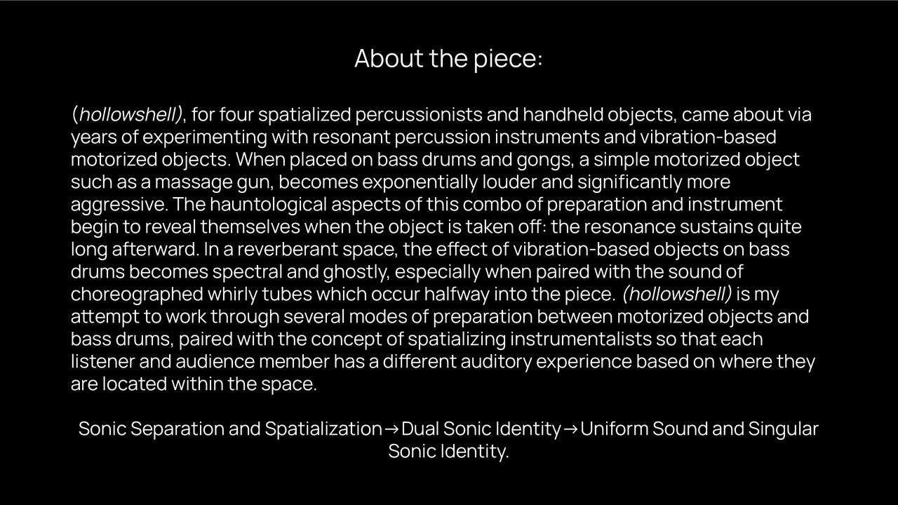 (hollowshell), for four spatialized percussionists and handheld objects, came about via years of experimenting with resonant percussion instruments and vibration-based motorized objects. When placed on bass drums and gongs, a simple motorized object such as a massage gun becomes exponentially louder and significantly more aggressive. The hauntological aspects of this combination of preparation and instrument begin to reveal themselves when the object is taken off: the resonance sustains quite long afterward. In a reverberant space, the effect of vibration-based objects on bass drums becomes spectral and ghostly, especially when paired with the sound of choreographed whirly tubes which occur halfway into the piece. (hollowshell) is my attempt to work through several modes of preparation between motorized objects and bass drums, paired with the concept of spatializing instrumentalists so that each listener and audience member has a different auditory experience based on where they are located within the space.