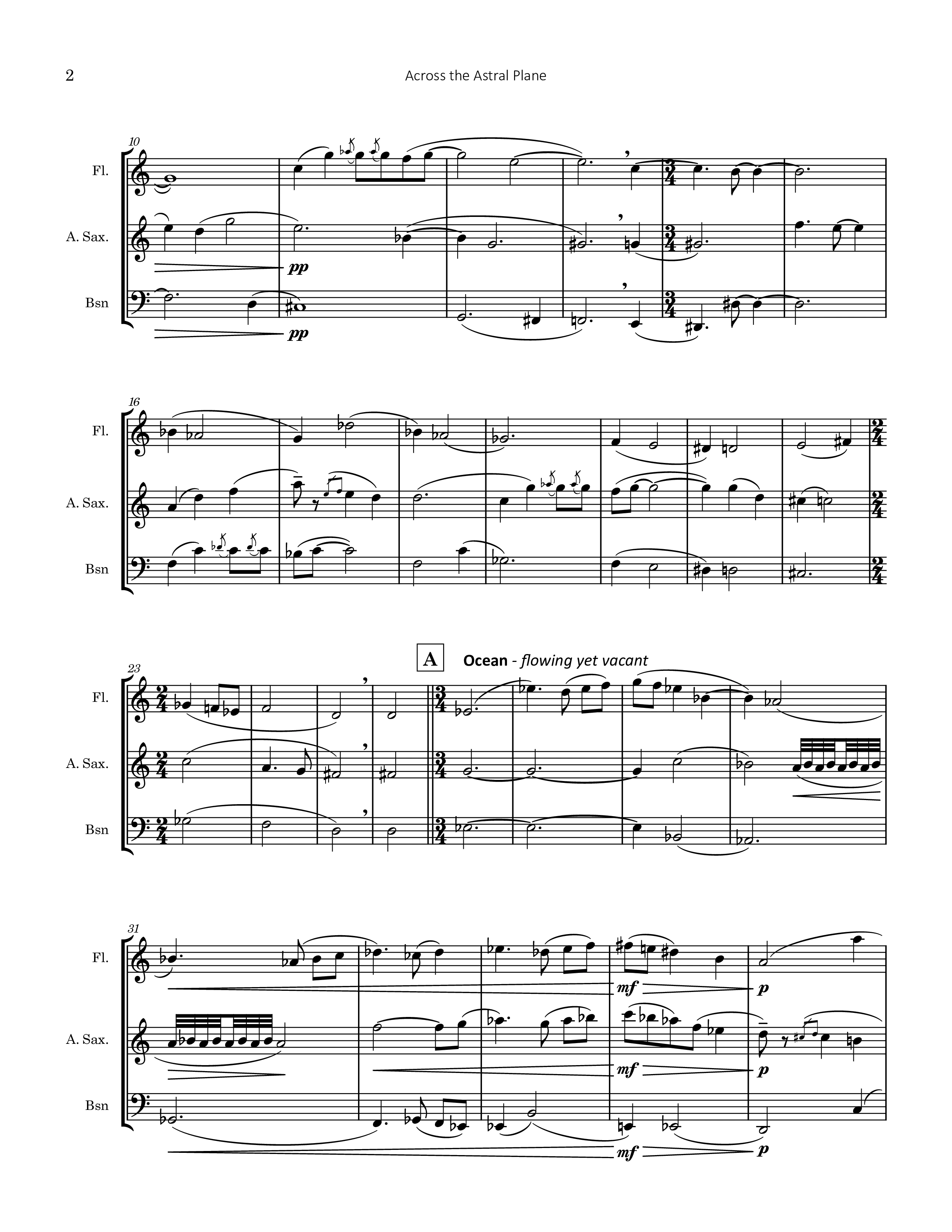 Across the Astral Plane is a 7-minute woodwind trio dedicated to the vastness and liveliness of outer space, and it takes the listener on a dramatic journey through different space "landmarks" as the unique sounds of flute, alto saxophone, and bassoon paint a picture of abounding quiet, determined loneliness, and flowing vacancy.