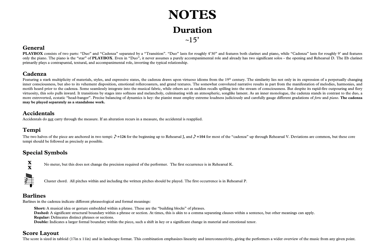 PLAYBOX consists of two parts: “Duo” and “Cadenza” separated by a “Transition”. The piano is the “star” of PLAYBOX. Even in “Duo”, it never assumes a purely accompanimental role and already has two significant solos - the opening and Rehearsal D. The Eb clarinet primarily plays a contrapuntal, textural, and accompanimental role, inverting the typical relationship. The cadenza features a stark multiplicity of materials, styles, and expressive states, the cadenza draws upon virtuoso idioms from the 19th century. The similarity lies not only in its expression of a perpetually changing inner consciousness, but also to its vehement disposition, emotional roller coasters, and grand textures. The somewhat convoluted narrative results in part from the manifestation of melodies, harmonies, and motifs heard prior to the cadenza. Some seamlessly integrate into the musical fabric, while others act as sudden recalls spilling into the stream of consciousness. But despite its rapid-fire outpouring and fiery